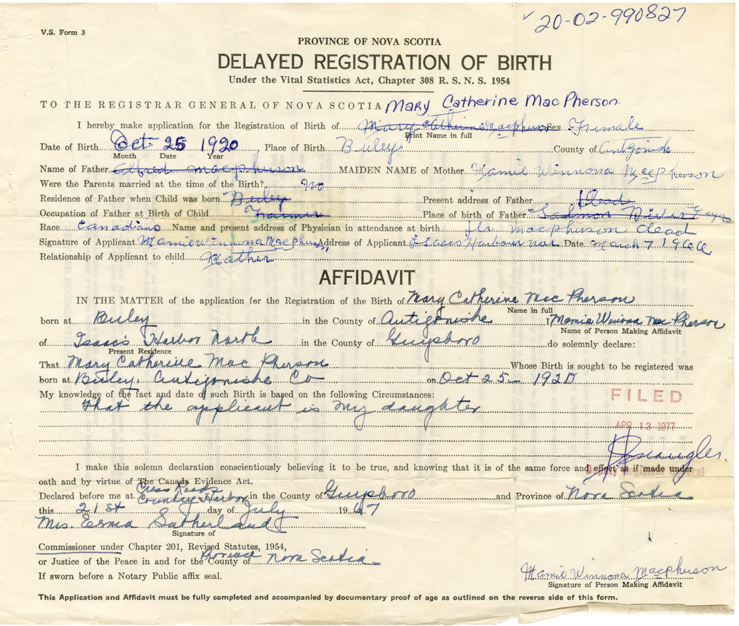 Signature of Applicant Mamie Winnona MacPherson Address of Applicant Isaac's Harbour Date March 7, 1966