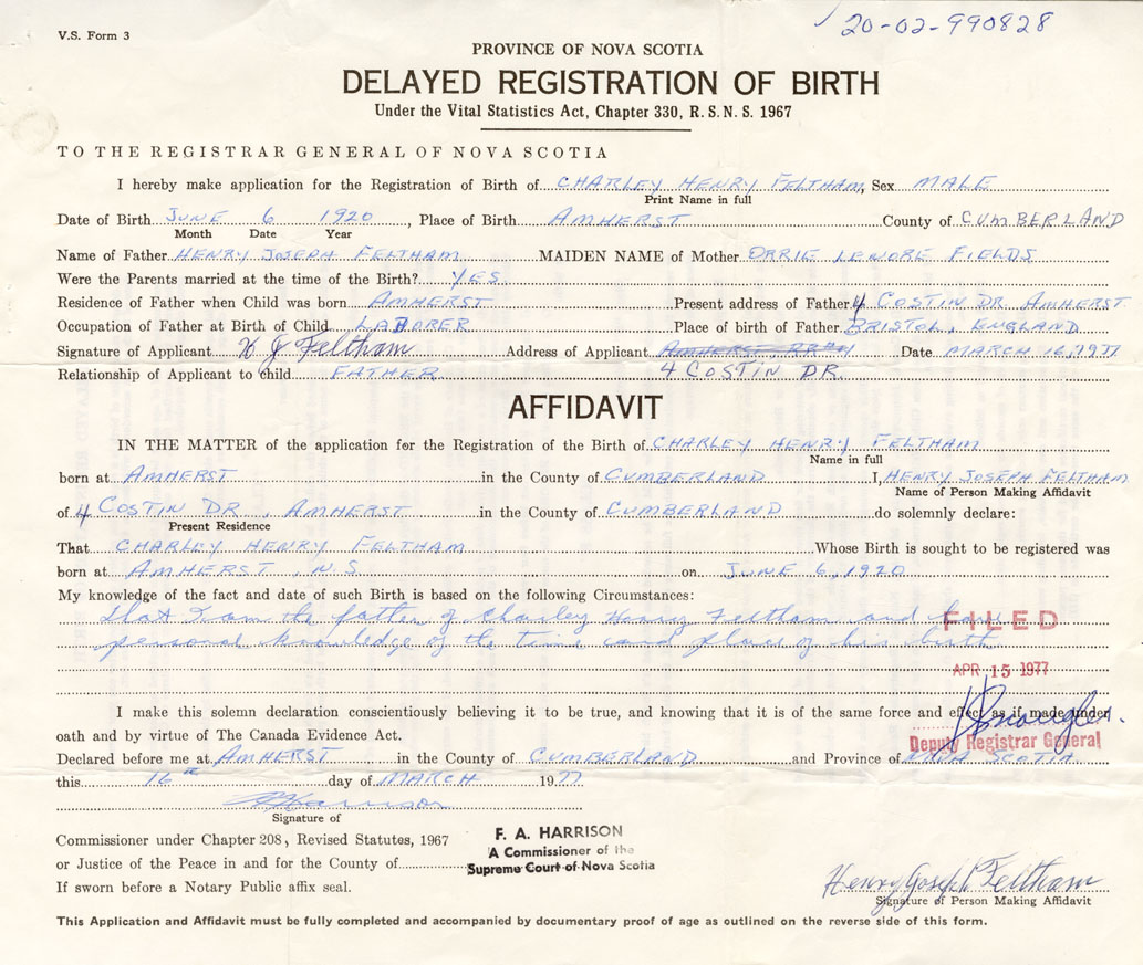 That I am the father of Charley Henry Feltham and have personal knowledge of the time and place of his birth.