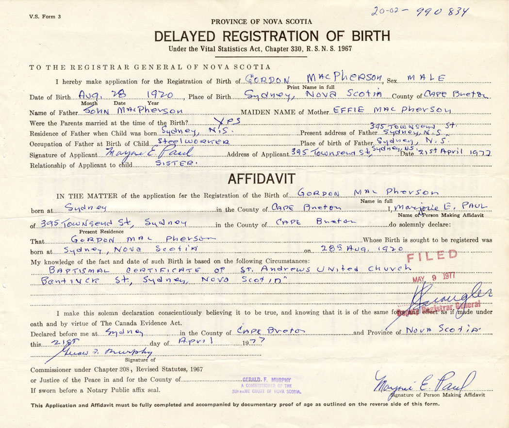 I hereby make application for the Registration of Birth of GordonMacPherson Sex