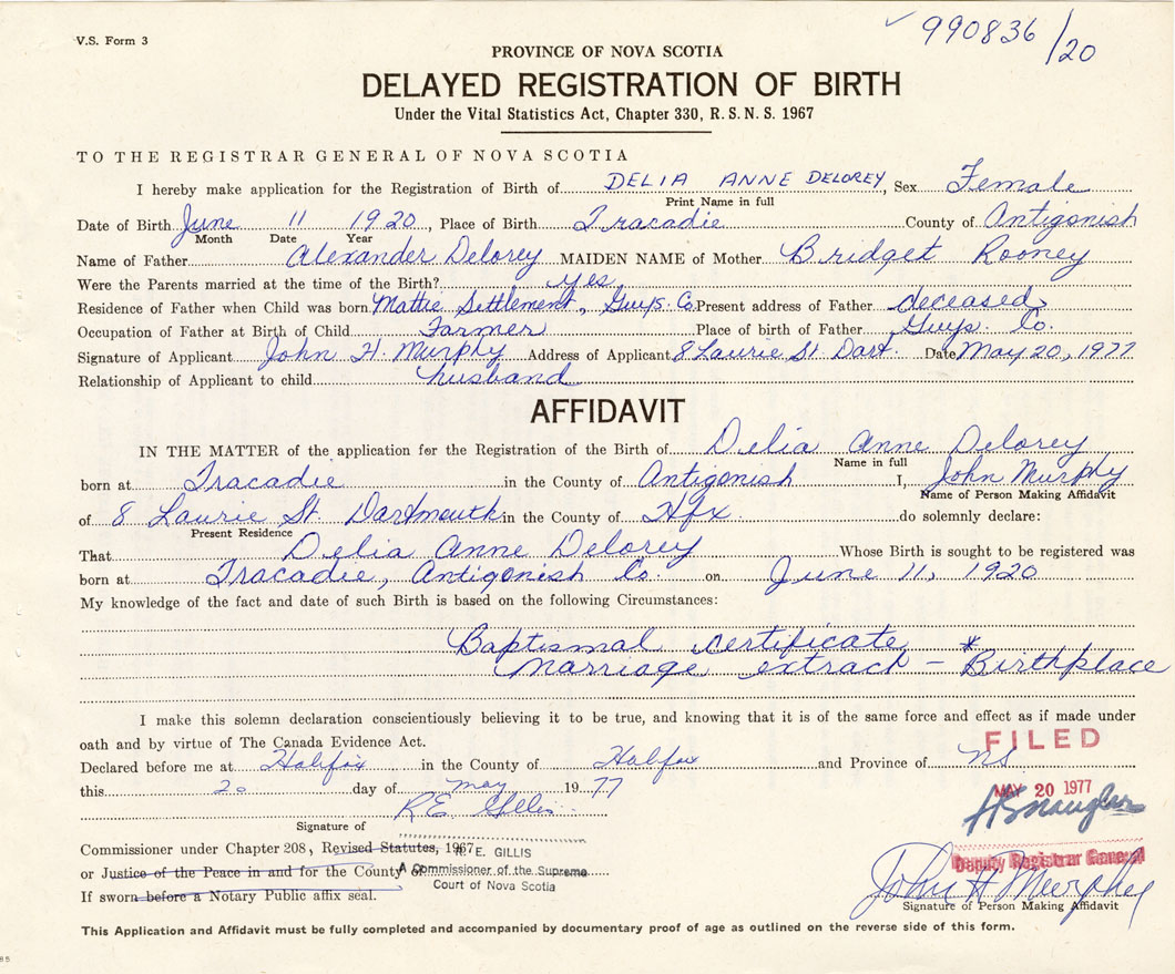 Date of Birth June 11, 1920 Place of Birth TracadieCounty of Antigonish