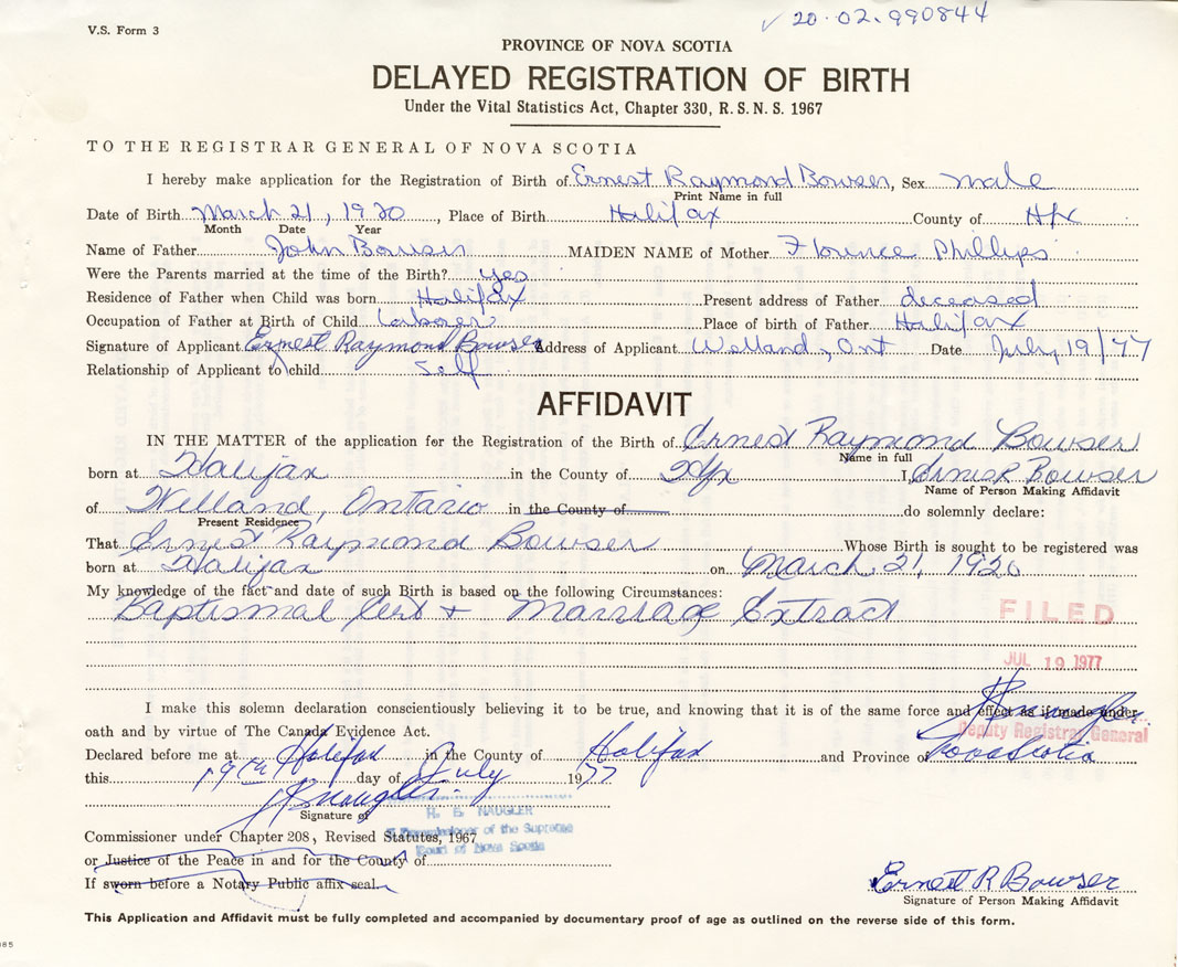 I hereby make application for the Registration of Birth of Ernest RaymondBowser Sex Male