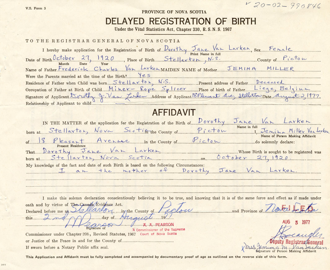 Signature of Applicant Dorothy J. Van Larken Address of Applicant Stellarton Date August 2, 1977