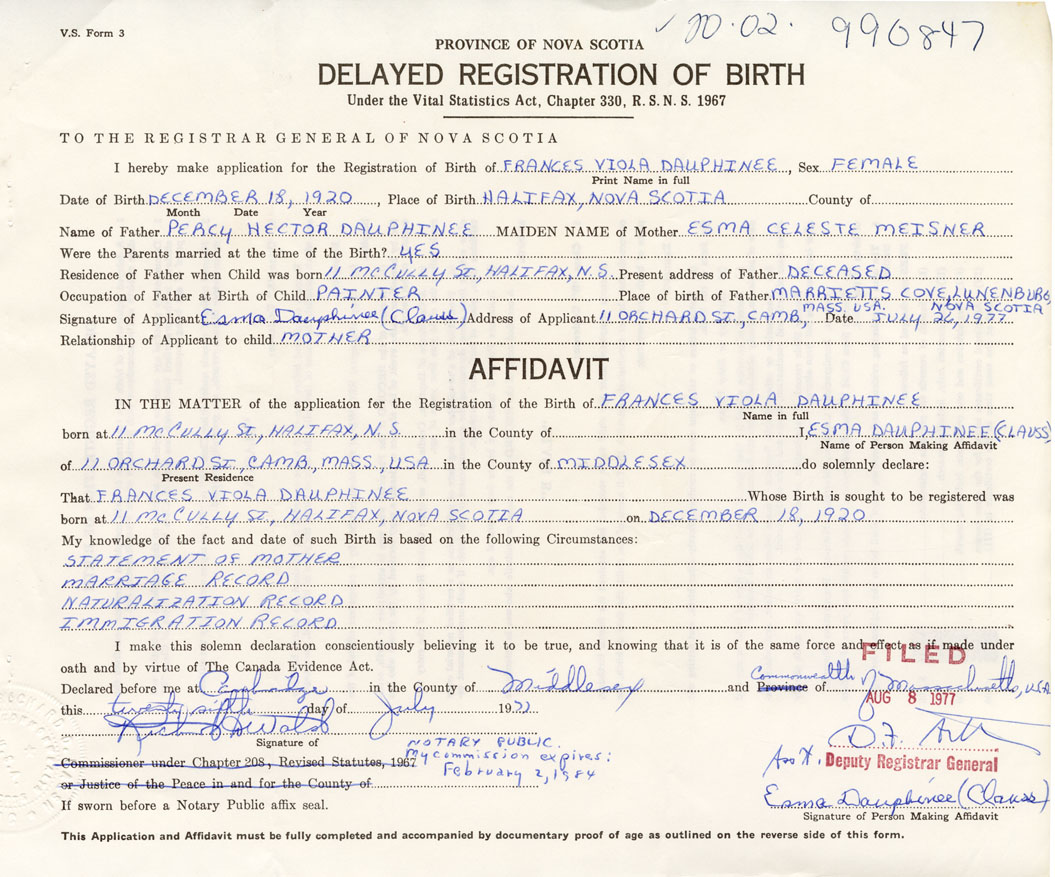 I hereby make application for the Registration of Birth of Frances ViolaDauphinee Sex Female