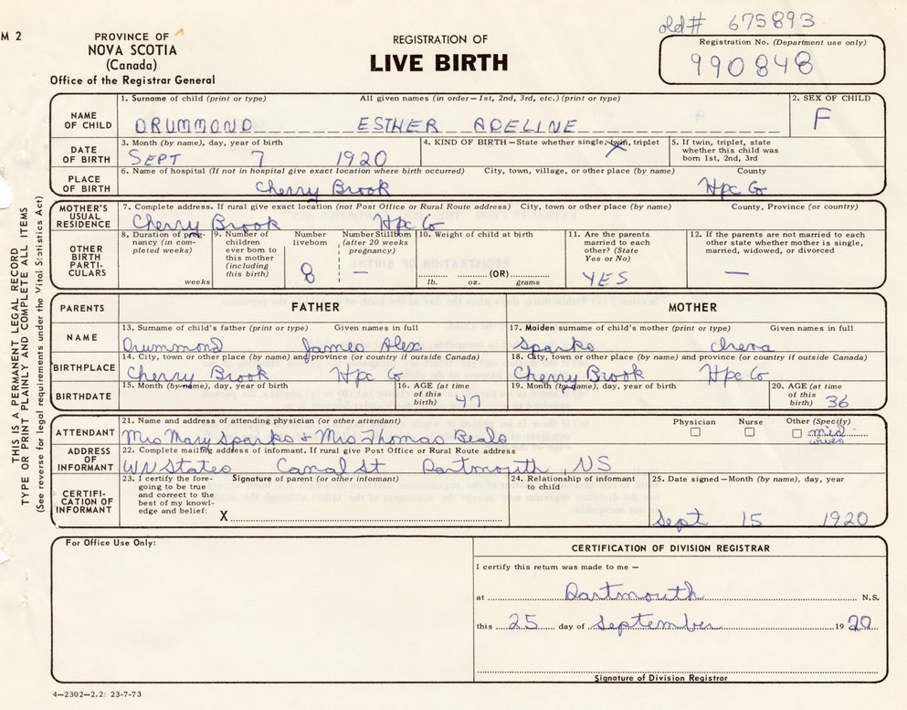 Date of Birth September 7, 1920 Place of Birth Cherry BrookCounty of Halifax