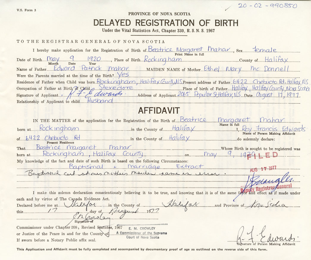 I hereby make application for the Registration of Birth of Beatrice MargaretMahar Sex Female