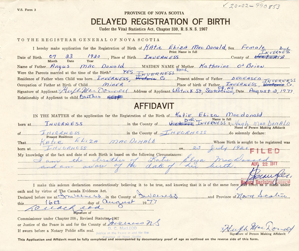 Date of Birth July 23, 1920 Place of Birth InvernessCounty of Inverness