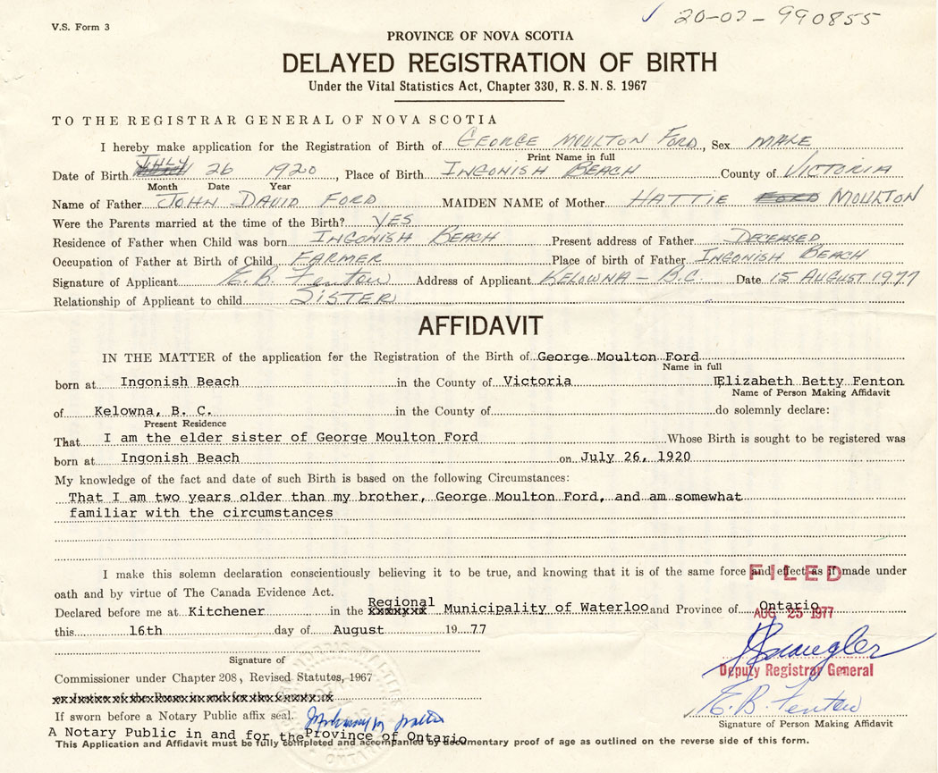 Date of Birth July 26, 1920 Place of Birth Ingonish BeachCounty of Victoria
