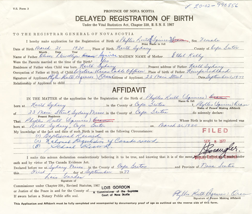 Signature of Applicant Phyllis Ruth (Squire) Oram Address of Applicant Sydney Mines Date September 1, 1977