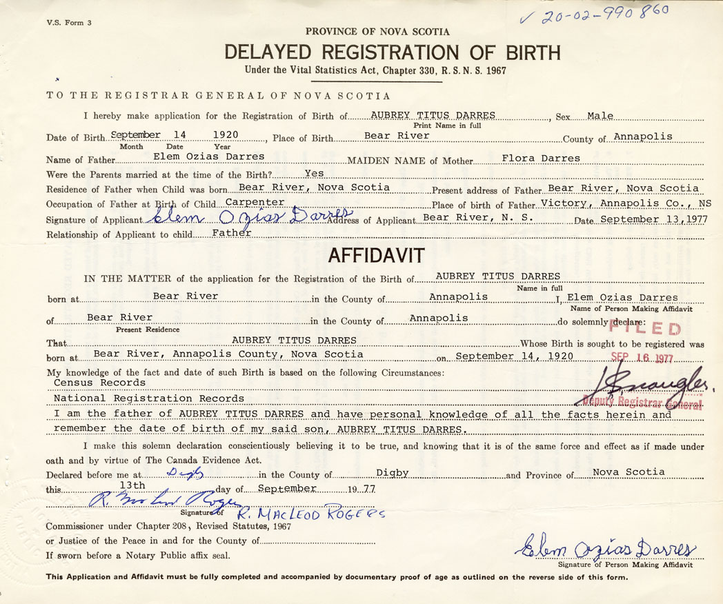 Date of Birth September 14, 1920 Place of Birth Bear RiverCounty of Annapolis