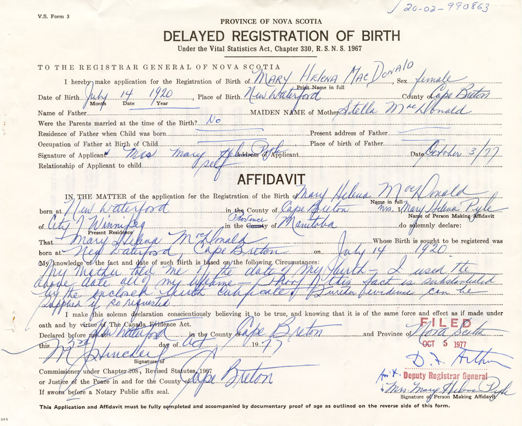 Date of Birth July 14, 1920 Place of Birth New WaterfordCounty of Cape Breton