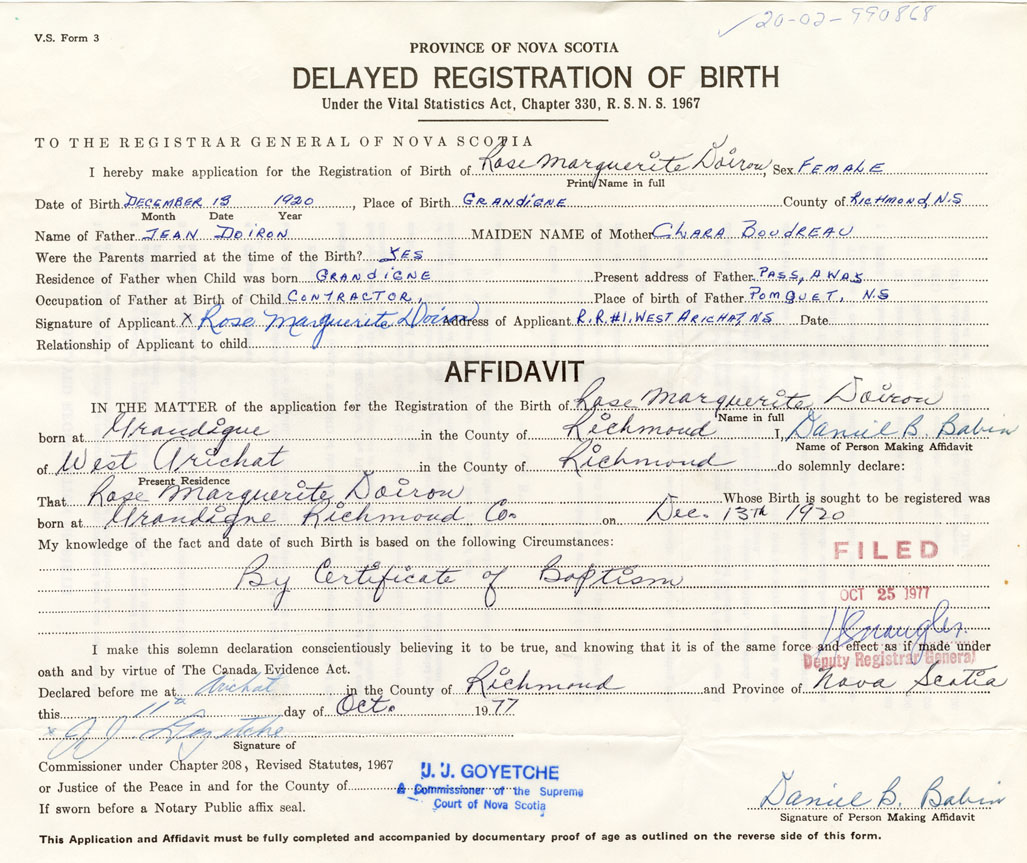 I hereby make application for the Registration of Birth of Rose MargueriteDoiron Sex Female