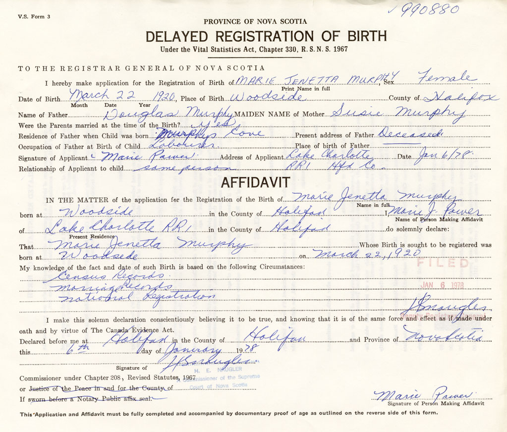 Date of Birth March 22, 1920 Place of Birth WoodsideCounty of Halifax