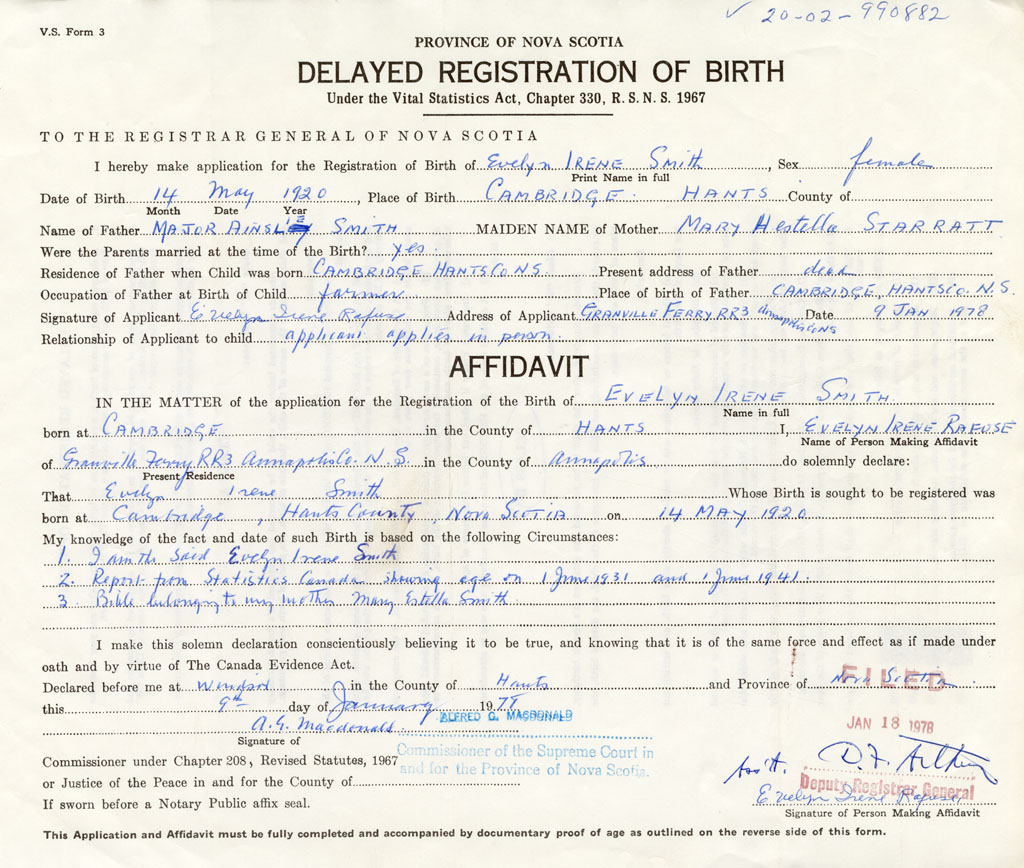 1. I am the said Evelyn Irene Smith 2. Report from Statistics Canada showing age in June 1, 1931 and June 1, 1941 3. Bible belonging to my mother Mary Hestella Smith