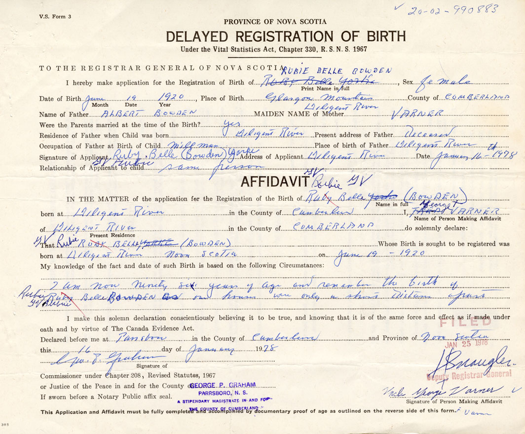Date of Birth June 19, 1920 Place of Birth Glasgow Mountain (Diligent River)County of Cumberland