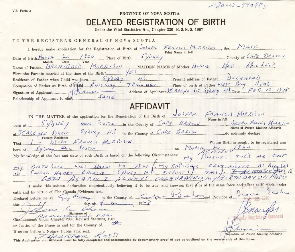 Date of Birth March 20, 1920 Place of Birth SydneyCounty of Cape Breton