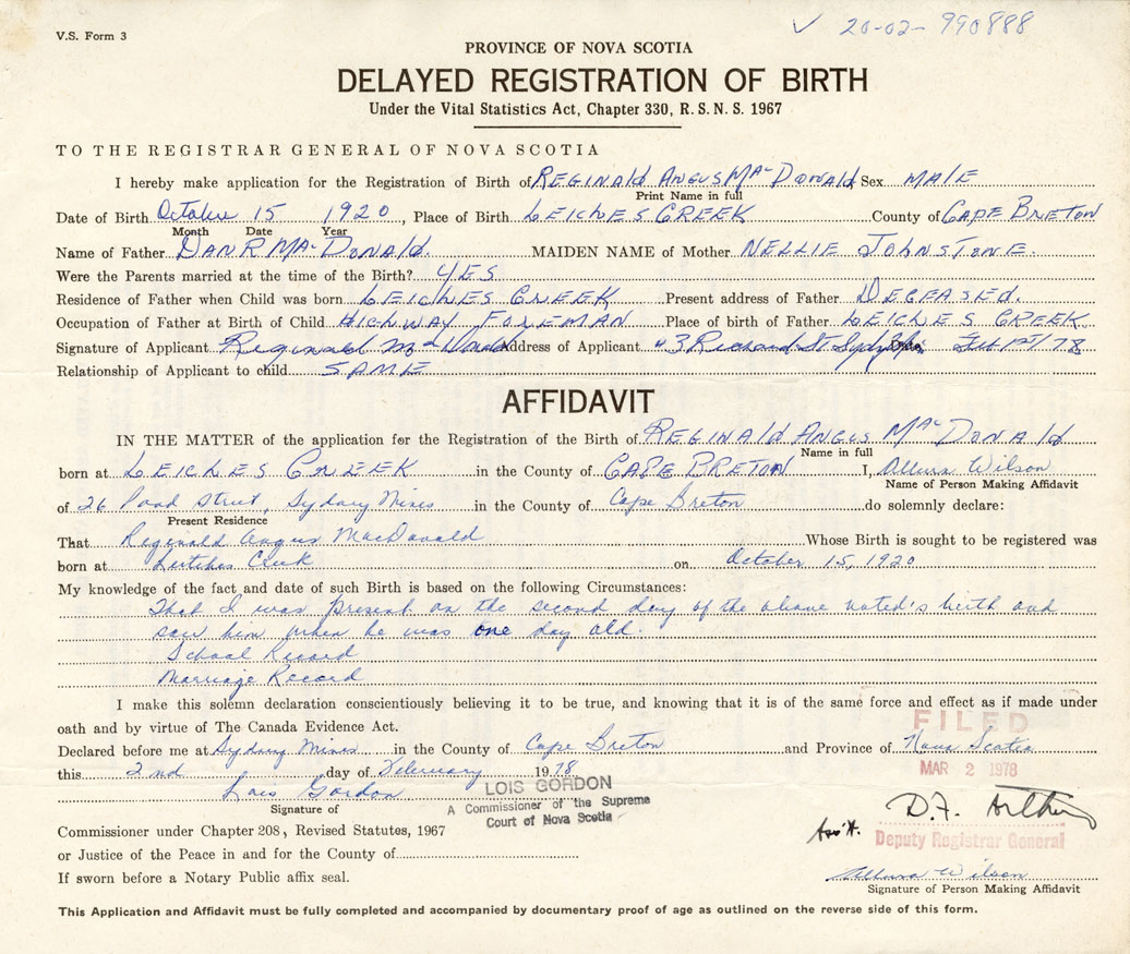 Signature of Applicant Reginald Angus MacDonald Address of Applicant Sydney Mines Date February 1, 1978