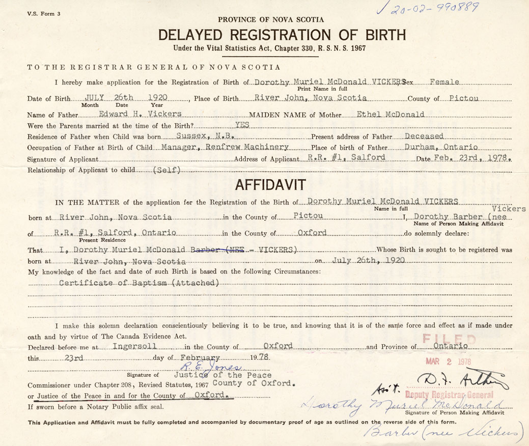 Date of Birth July 26, 1920 Place of Birth River JohnCounty of Pictou