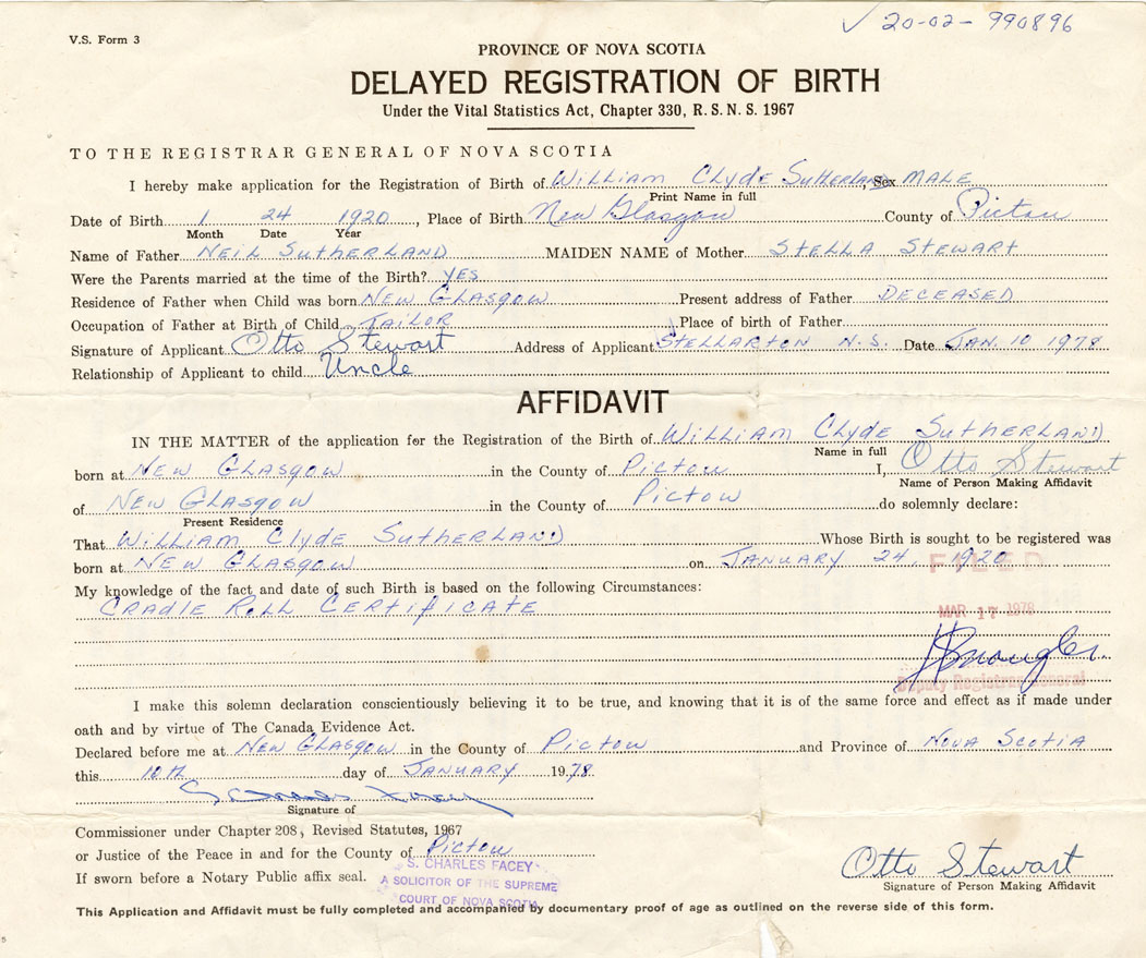 I hereby make application for the Registration of Birth of William ClydeSutherland Sex Male