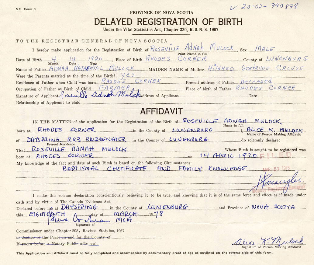 Date of Birth April 14, 1920 Place of Birth Rhodes CornerCounty of Lunenburg