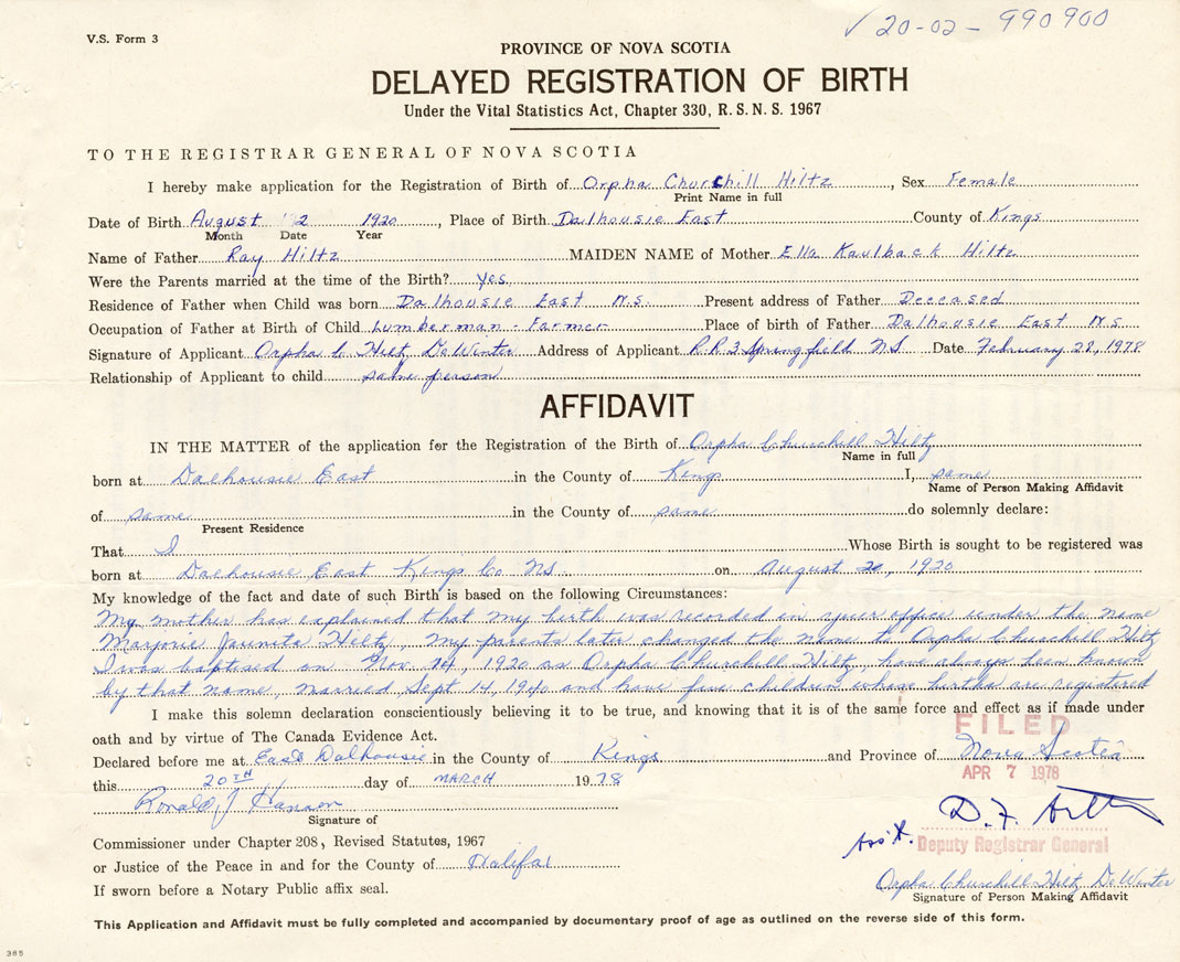 My mother has explained that my birth was recorded in your office under the name Marjorie Jaunita Hiltz, my parents later changed the name to Orpha Churchill Hiltz. I was baptized on November 14, 1920 as Orpha Churchill Hiltz have always been known by that name, married September 14, 1940 and have five children whose births are registered.