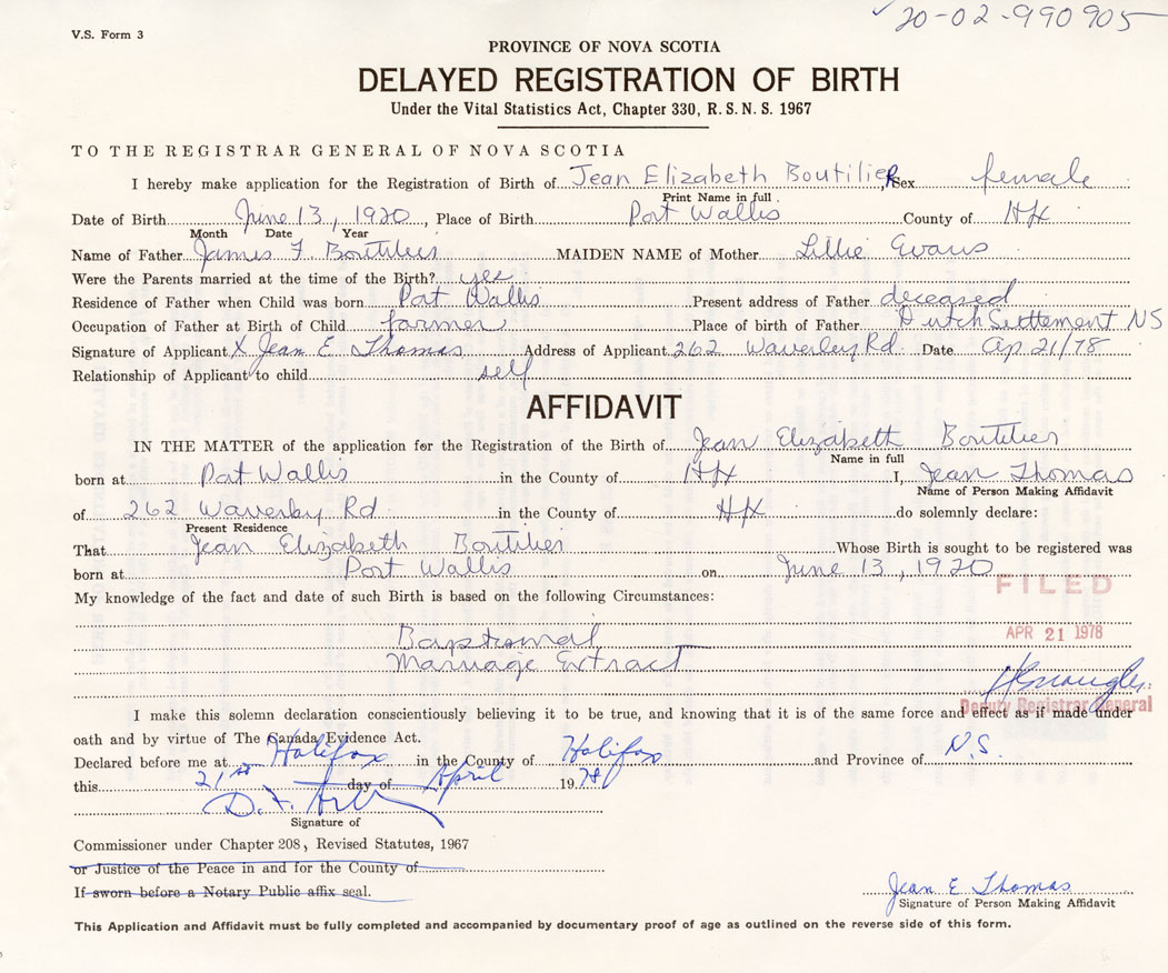I hereby make application for the Registration of Birth of Jean ElizabethBoutilier Sex Female