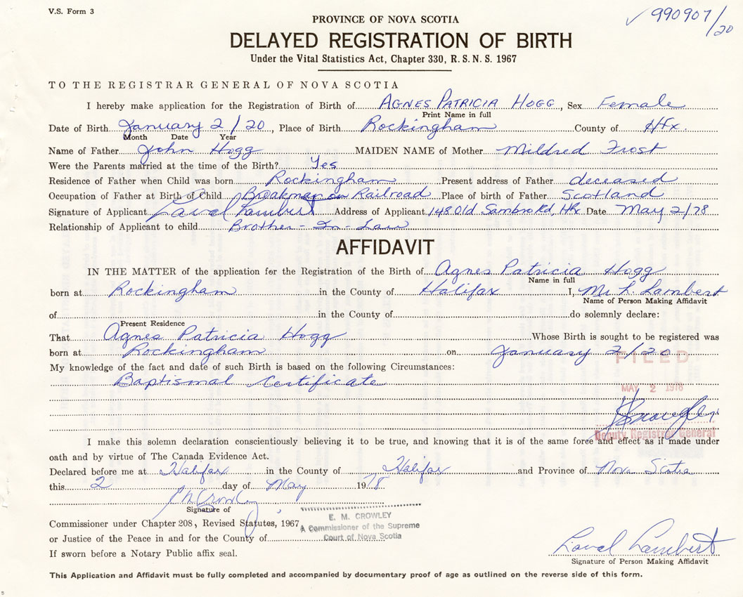 I hereby make application for the Registration of Birth of Agnes PatriciaHogg Sex Female