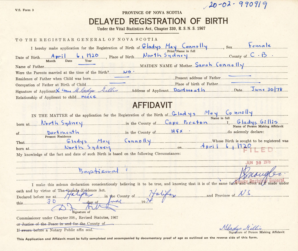 I hereby make application for the Registration of Birth of Gladys MayConnolly Sex Female