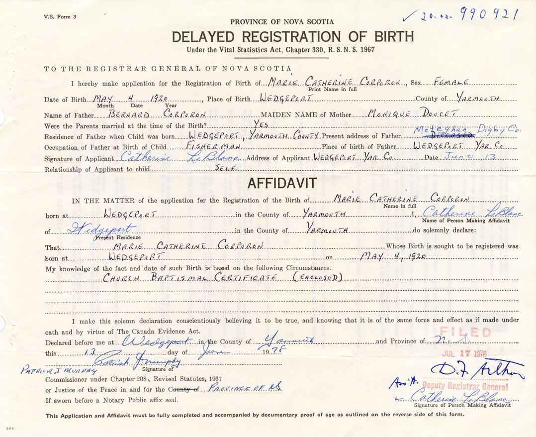 Signature of Applicant Catherine LeBlanc Address of Applicant Wedgeport Date June 13, 1978