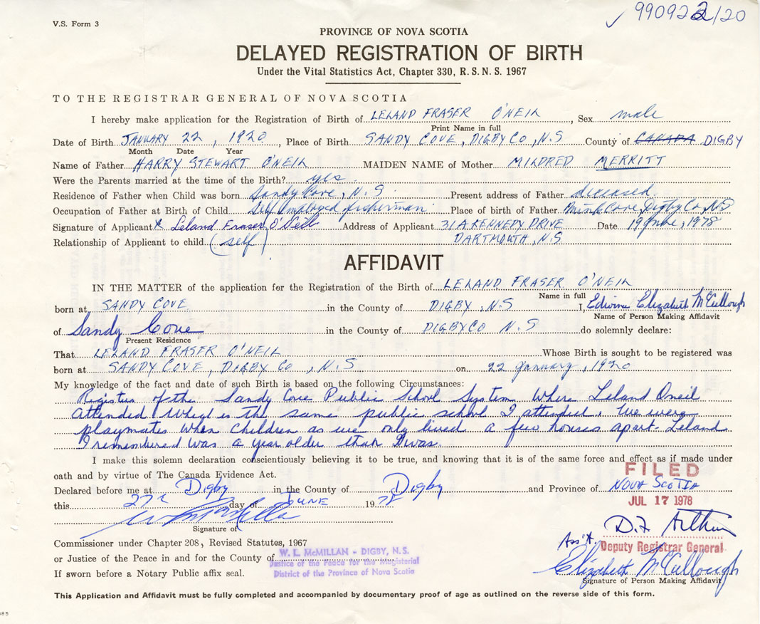 Date of Birth January 22, 1920 Place of Birth Sandy Cove County of Digby