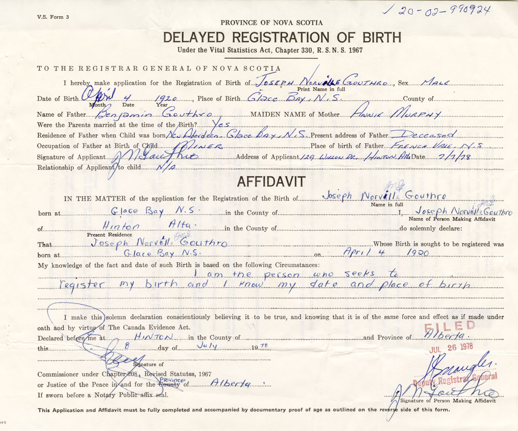I hereby make application for the Registration of Birth of Joseph NorvilleGouthro Sex Male