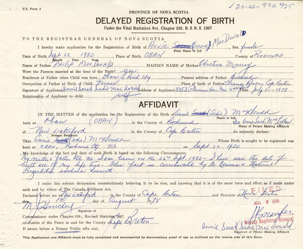 Signature of Applicant Annie Sarah Sadie MacDonald Address of Applicant New Waterford Date July 31, 1978