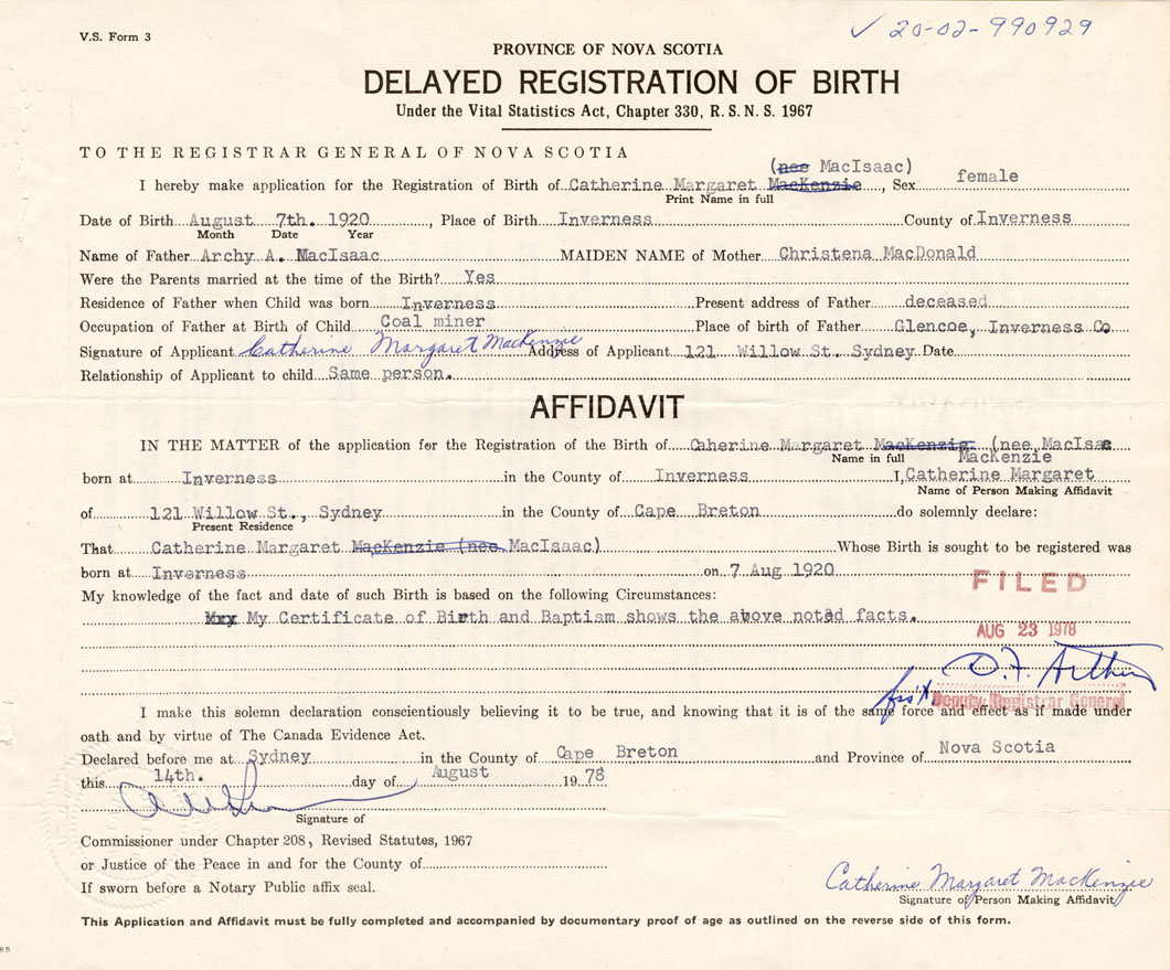 born at Inverness Inverness County on August 7, 1920