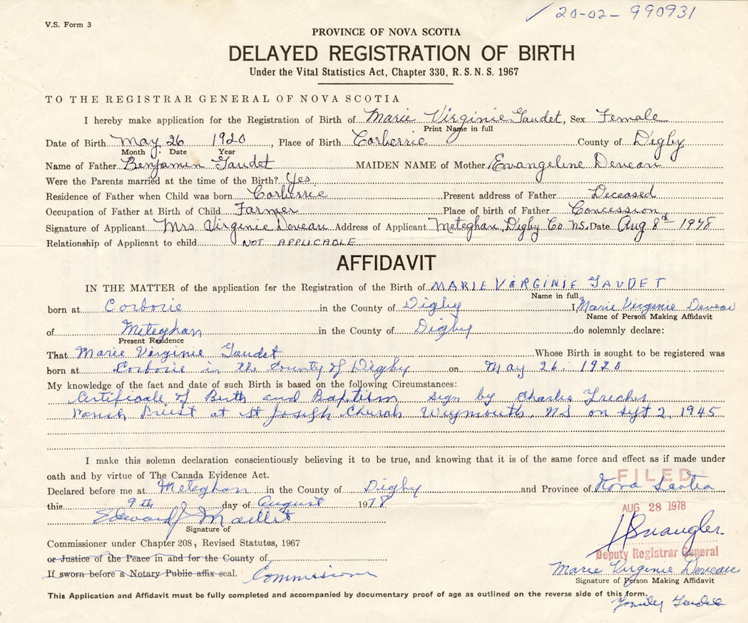 Signature of Applicant Virginie Deveau Address of Applicant Meteghan Date August 8, 1978