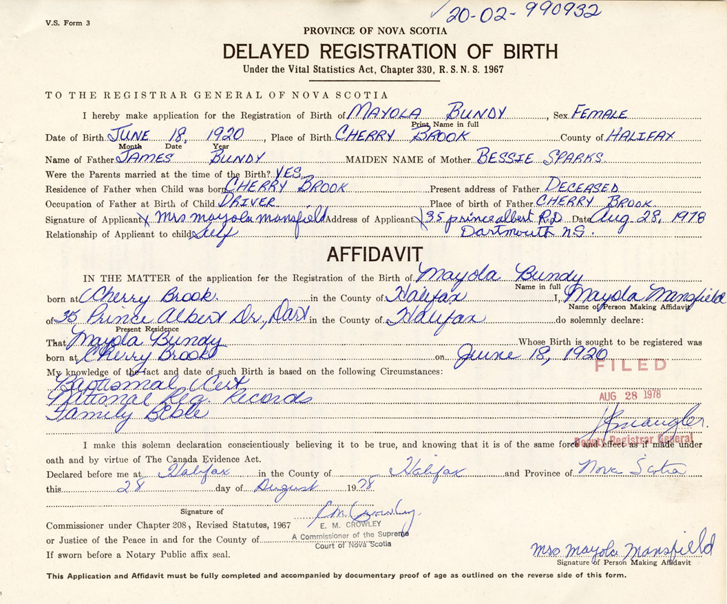 Date of Birth June 18, 1920 Place of Birth Cherry BrookCounty of Halifax