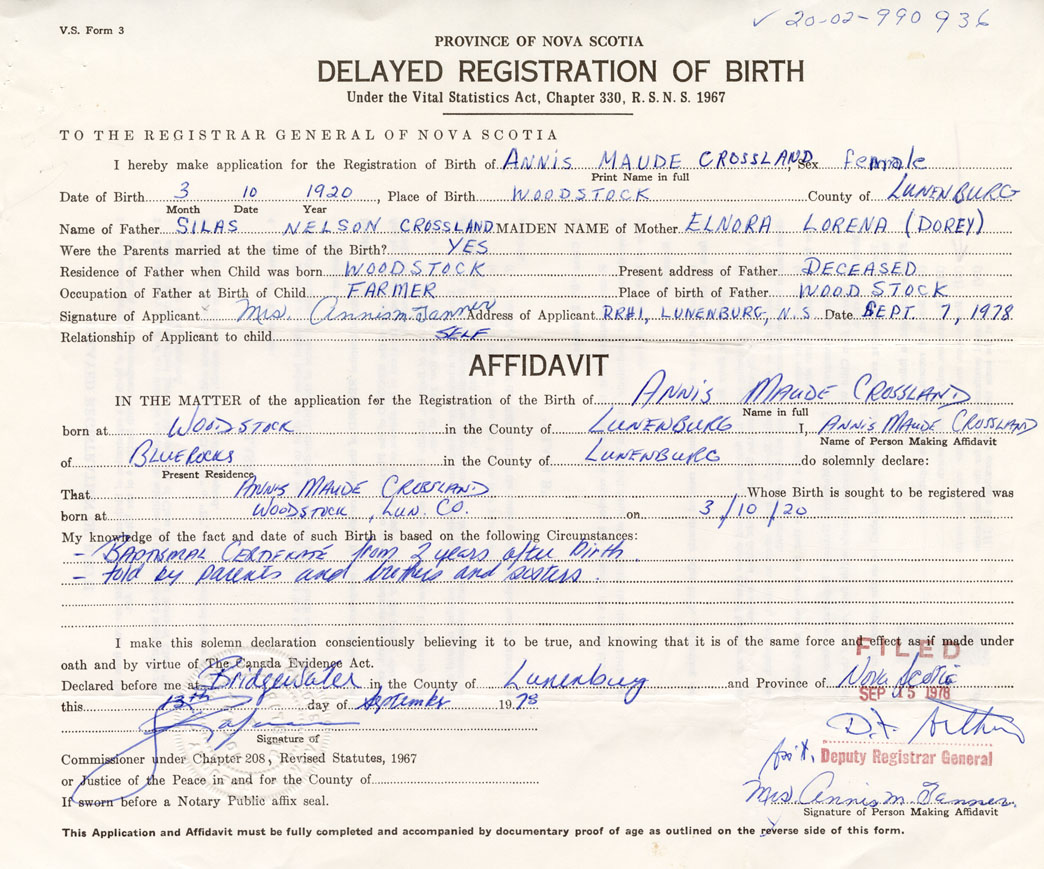 Date of Birth March 10, 1920 Place of Birth WoodstockCounty of Lunenburg