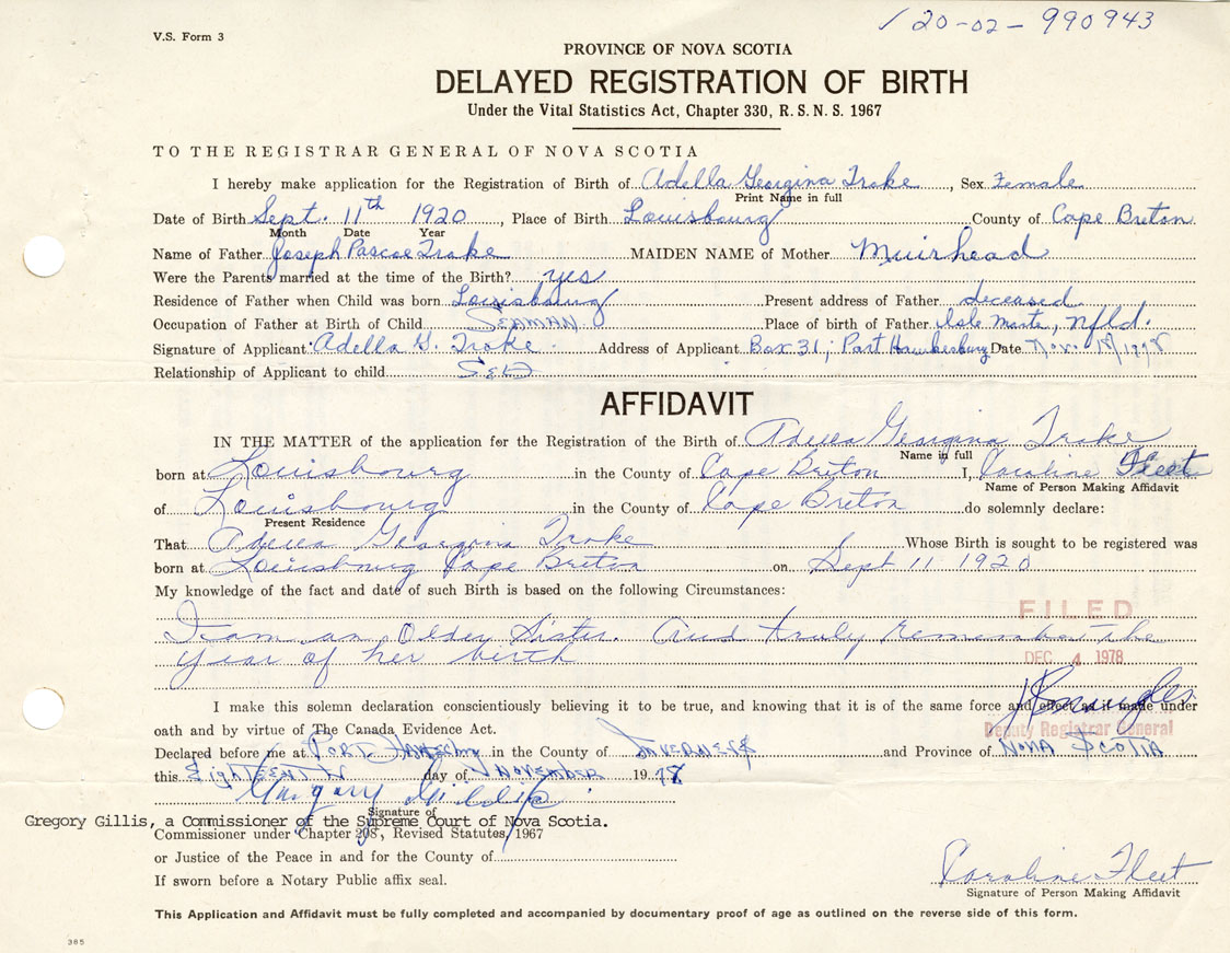 Date of Birth September 11, 1920 Place of Birth LouisburgCounty of Cape Breton