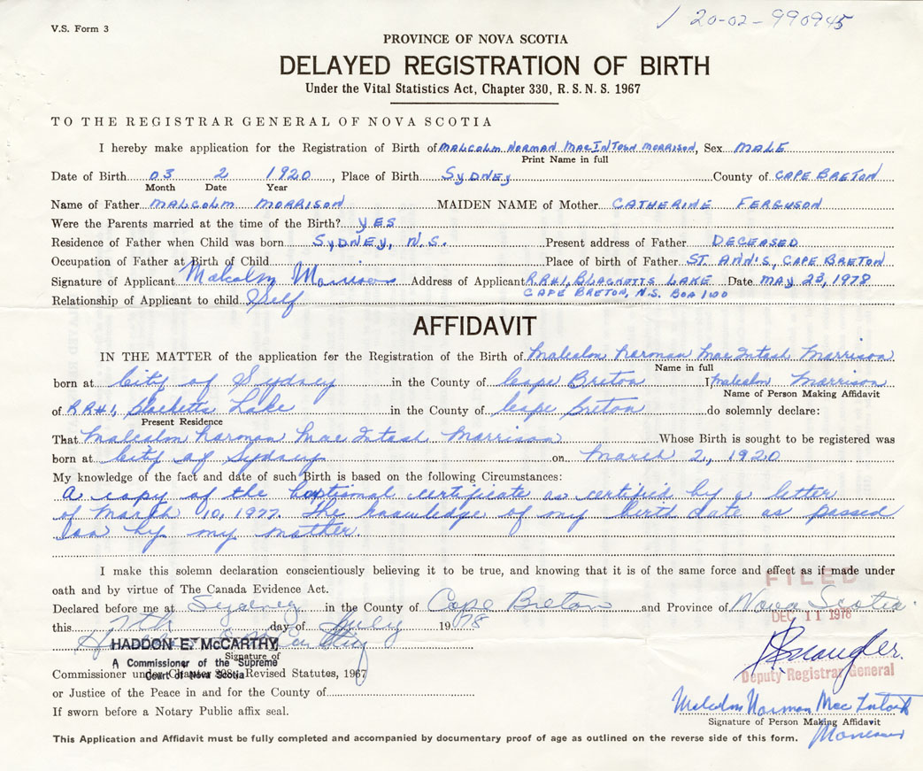 I hereby make application for the Registration of Birth of Malcolm Norman MacIntoshMorrison Sex Male