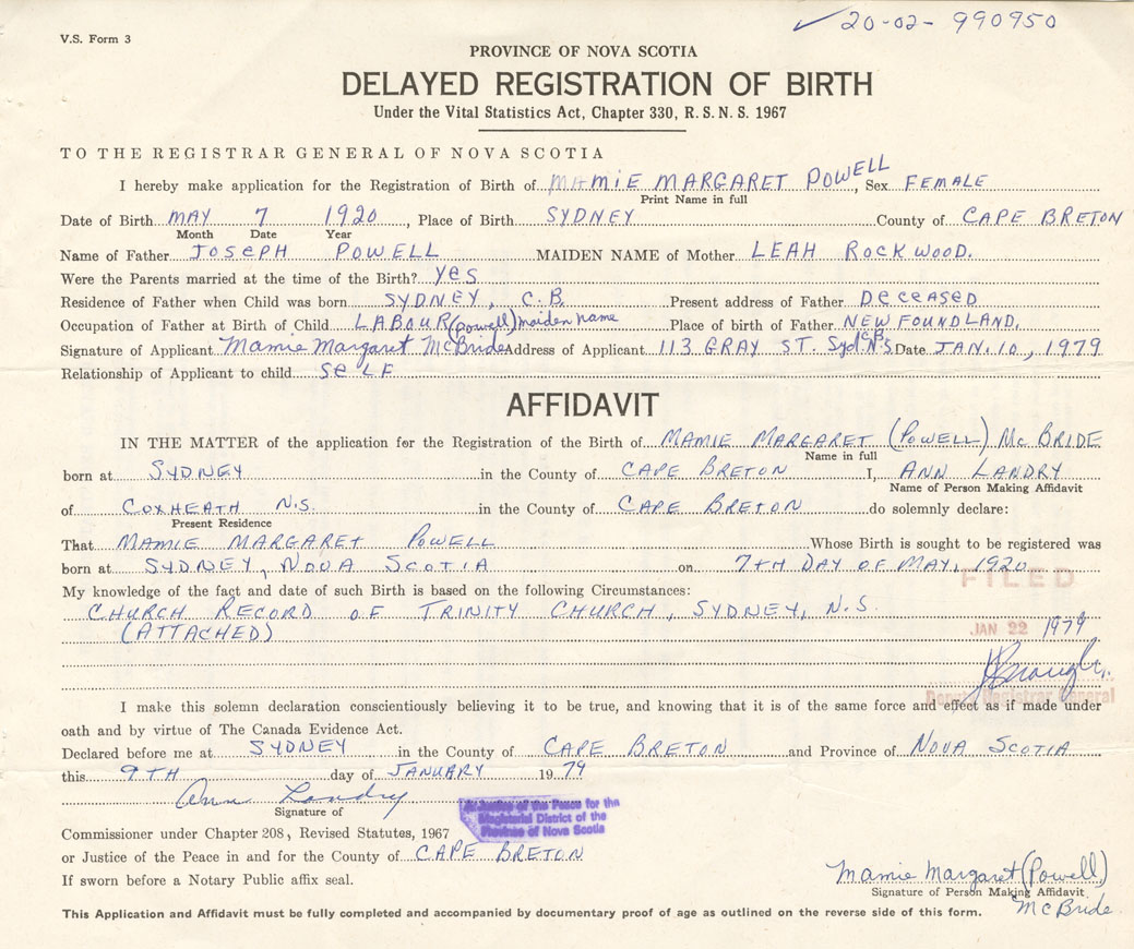 Signature of Applicant Mamie Margaret Powell McBride Address of Applicant Sydney Date January 10, 1979