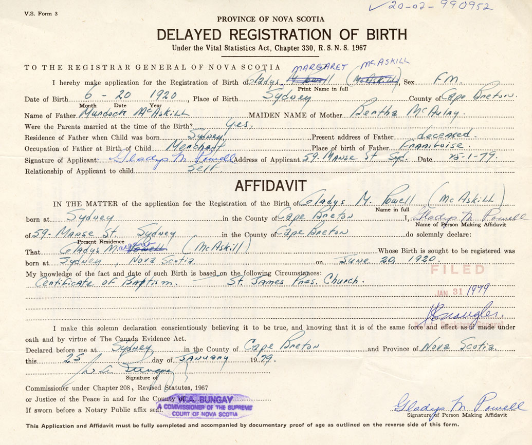 Date of Birth June 20, 1920 Place of Birth SydneyCounty of Cape Breton