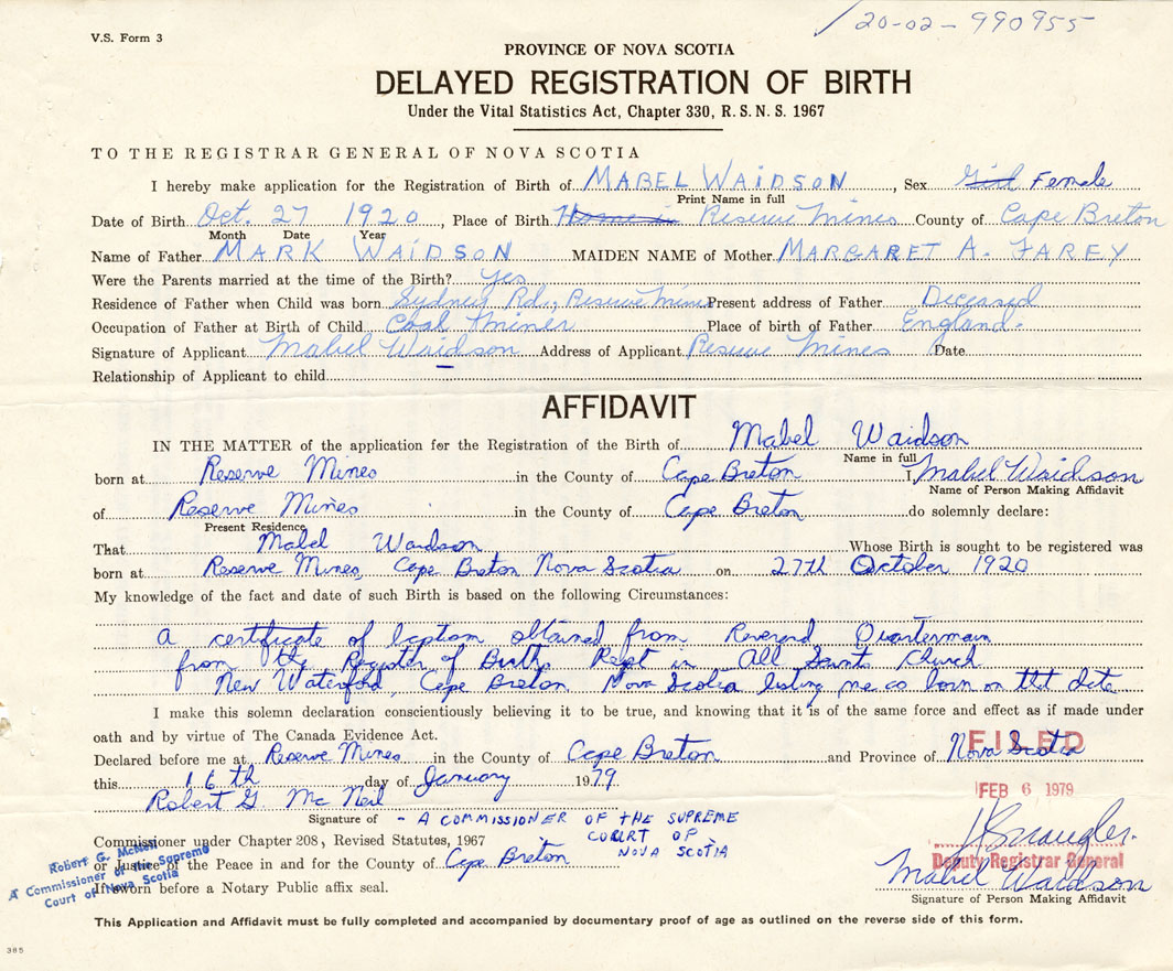 Date of Birth October 27, 1920 Place of Birth Reserve MinesCounty of Cape Breton