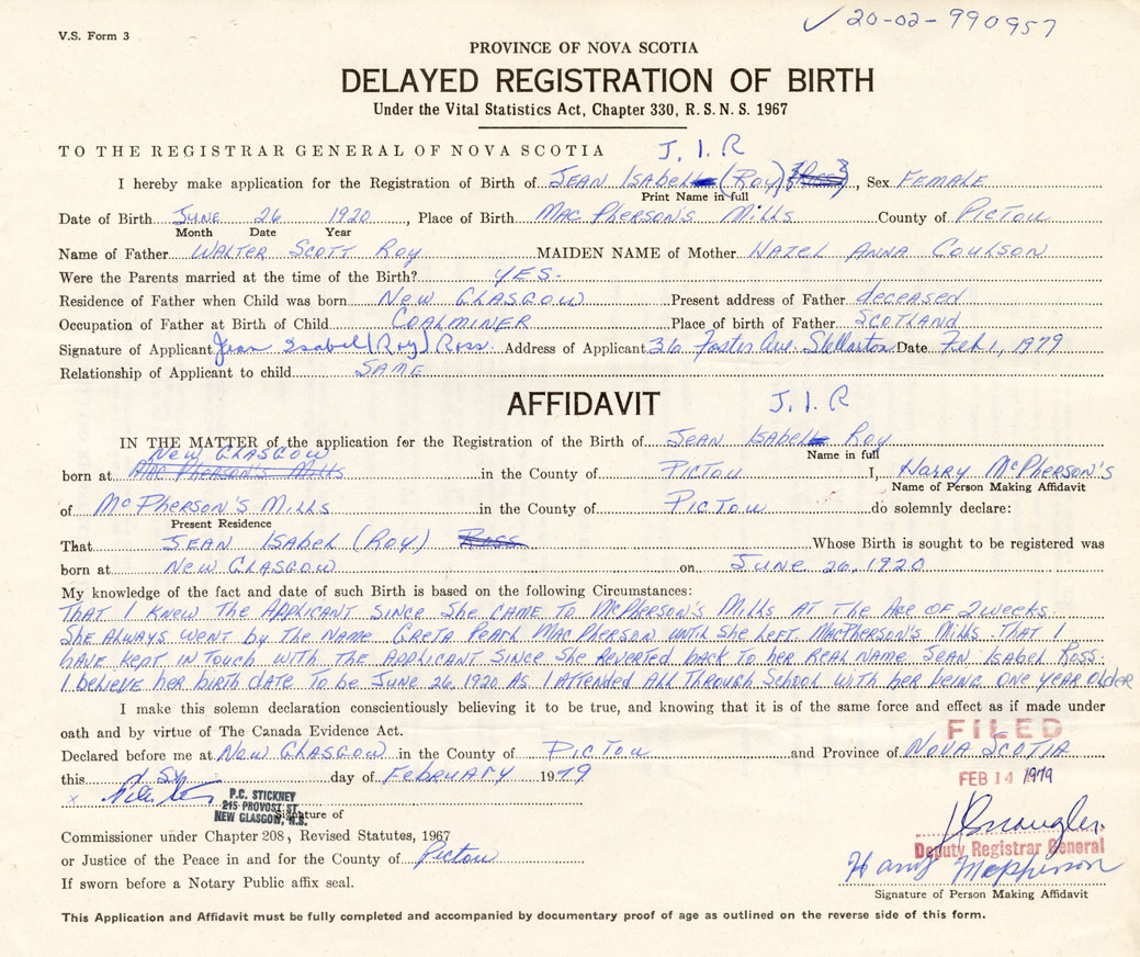 That I knew the applicant since she came to MacPherson's Mills at the age of two weeks. She always went by the name Greta Pearl MacPherson until she left MacPherson's Mills. That I have kept in touch with the applicant since she reverted back to her real name Jean Isabel Ross. I believe her birth date to be June 26, 1920. As I attended all through school with her being one year older.