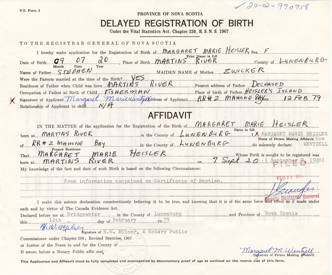 Signature of Applicant Margaret Marie Wentzell Address of Applicant Mahone Bay Date February 12, 1979