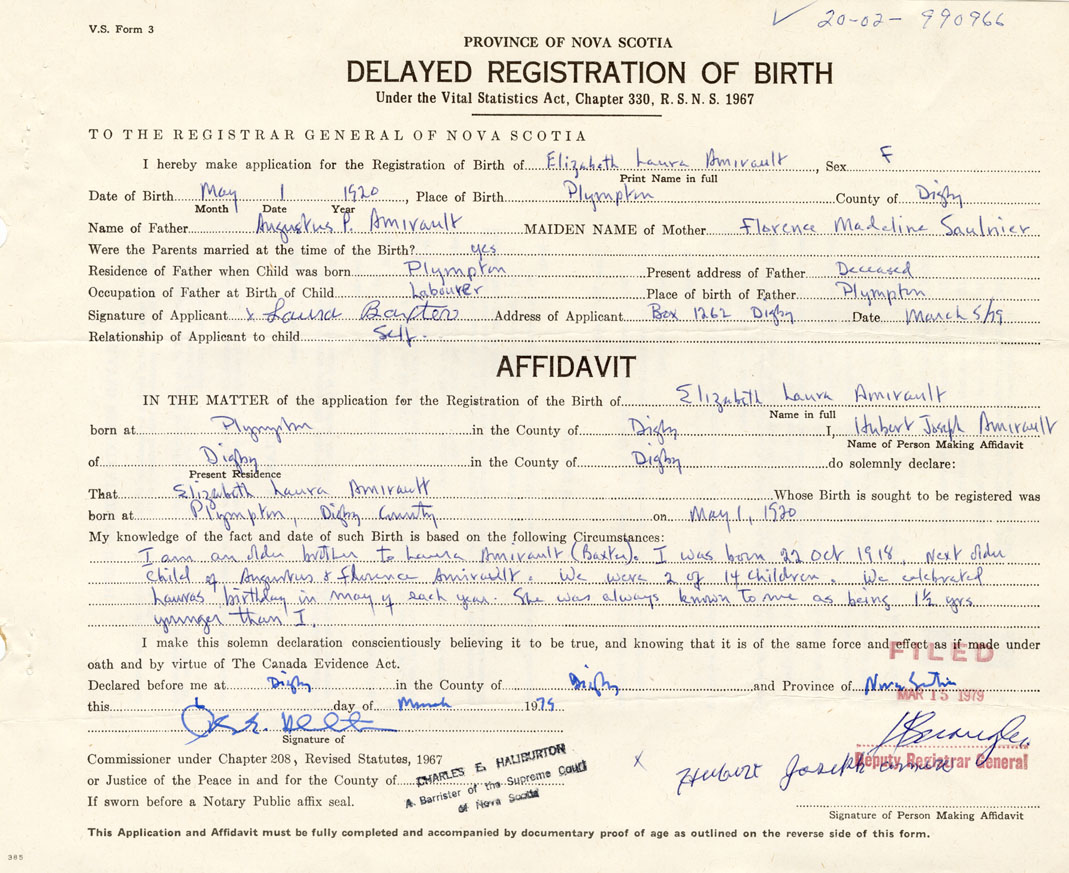 Date of Birth May 1, 1920 Place of Birth PlymptonCounty of Digby