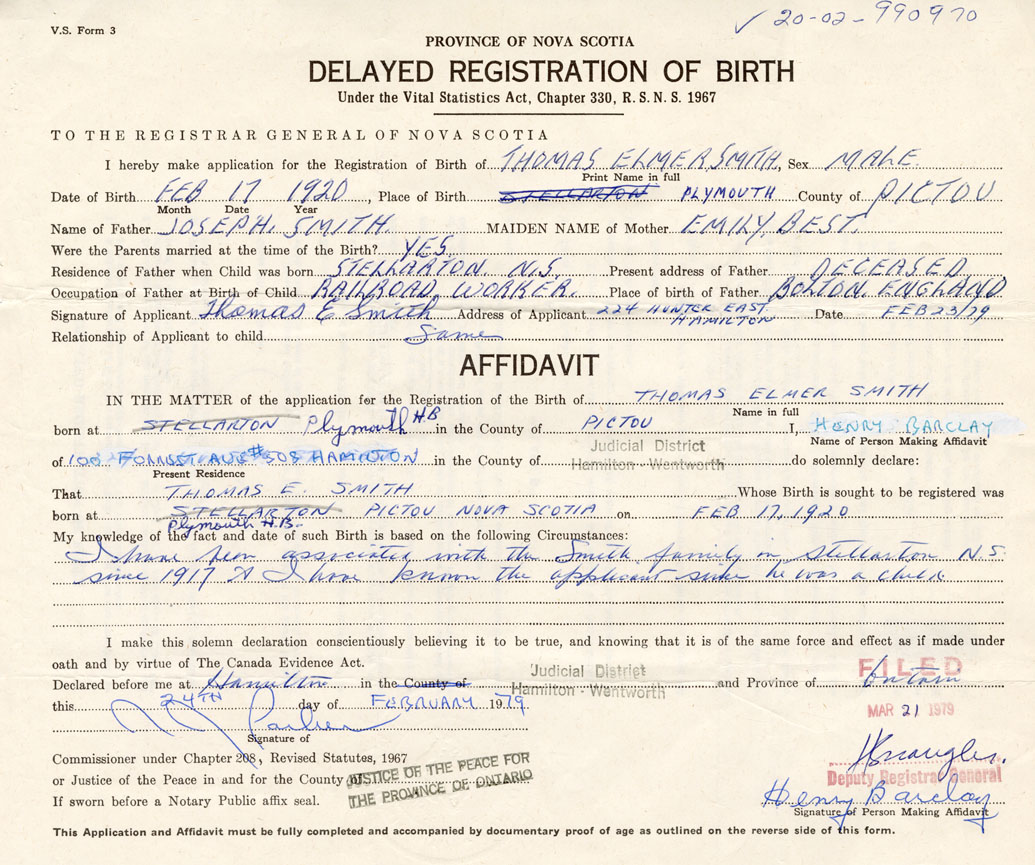 I have been associated with the Smith family in Stellarton since 1917 and I have known the applicant since he was a child. - Henry Barclay