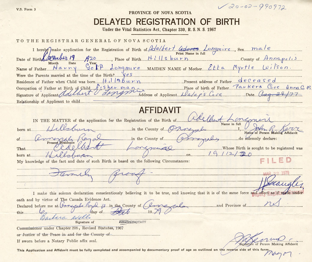 Signature of Applicant Adelbert V. Longmire Address of Applicant Delap's Cove Date August 29, 1979