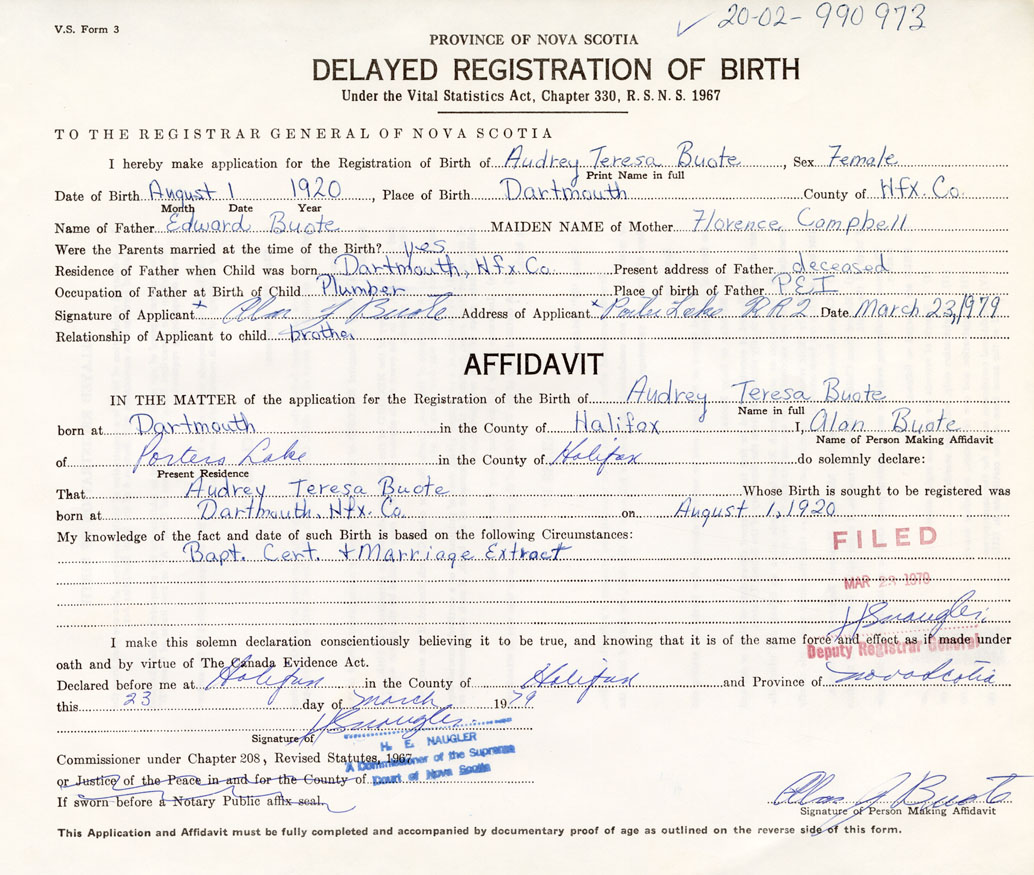 Date of Birth August 1, 1920 Place of Birth DartmouthCounty of Halifax