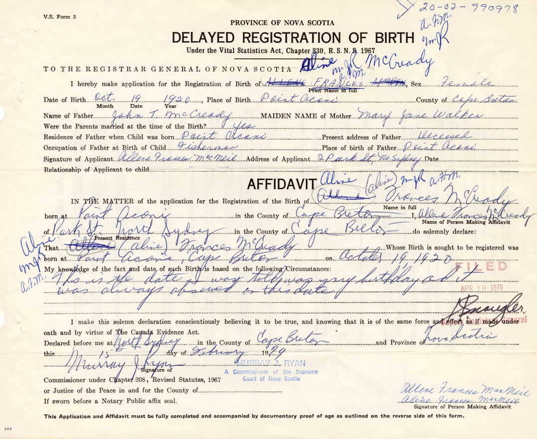 Signature of Applicant Aline Frances MacNeil Address of Applicant Sydney Date February 15, 1979