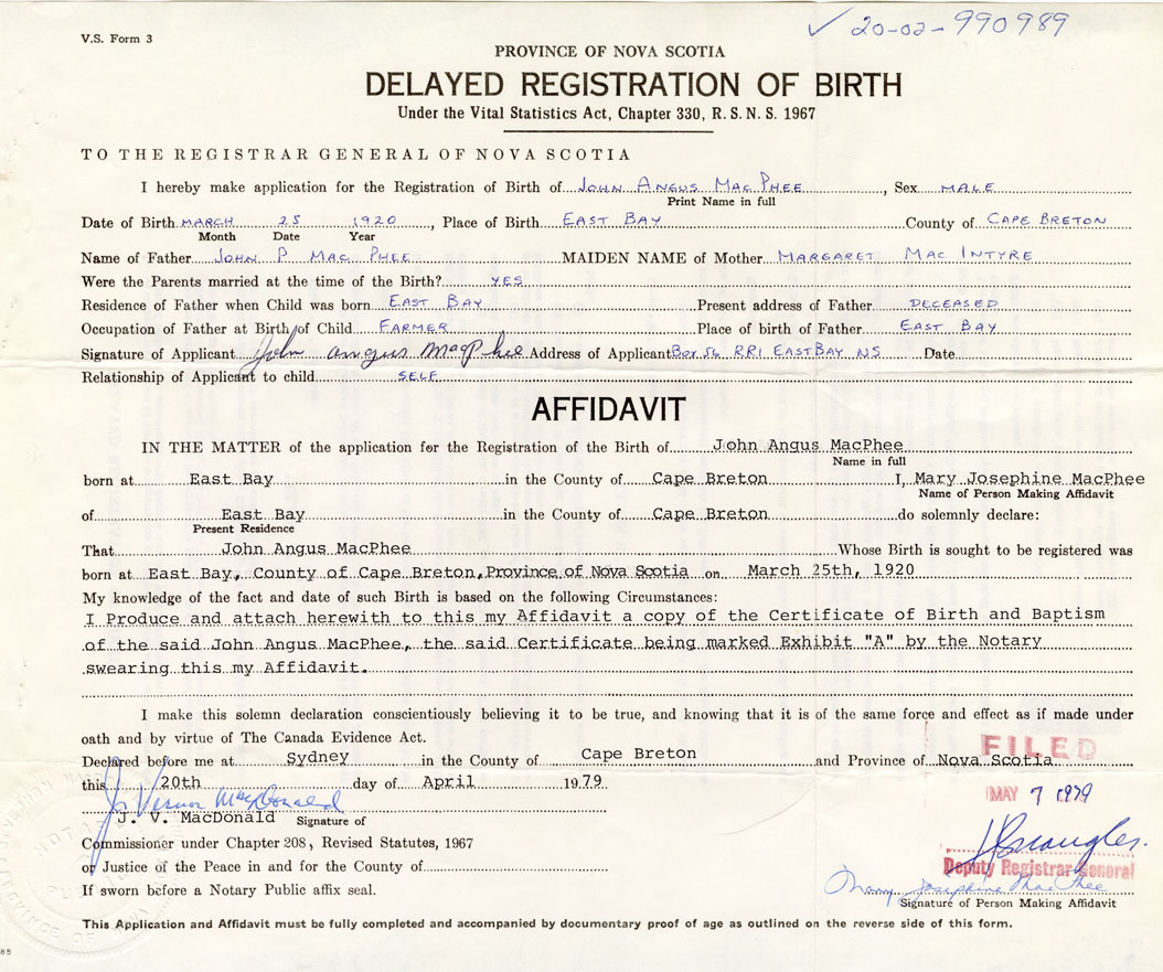I produce and attach herewith to this, my affidavit, a copy of the Certificate of Birth and Baptism of the said John Angus MacPhee, the said certificate being marked Exhibit "A" by the Notary swearing this my affidavit. - Mary Josephine MacPhee