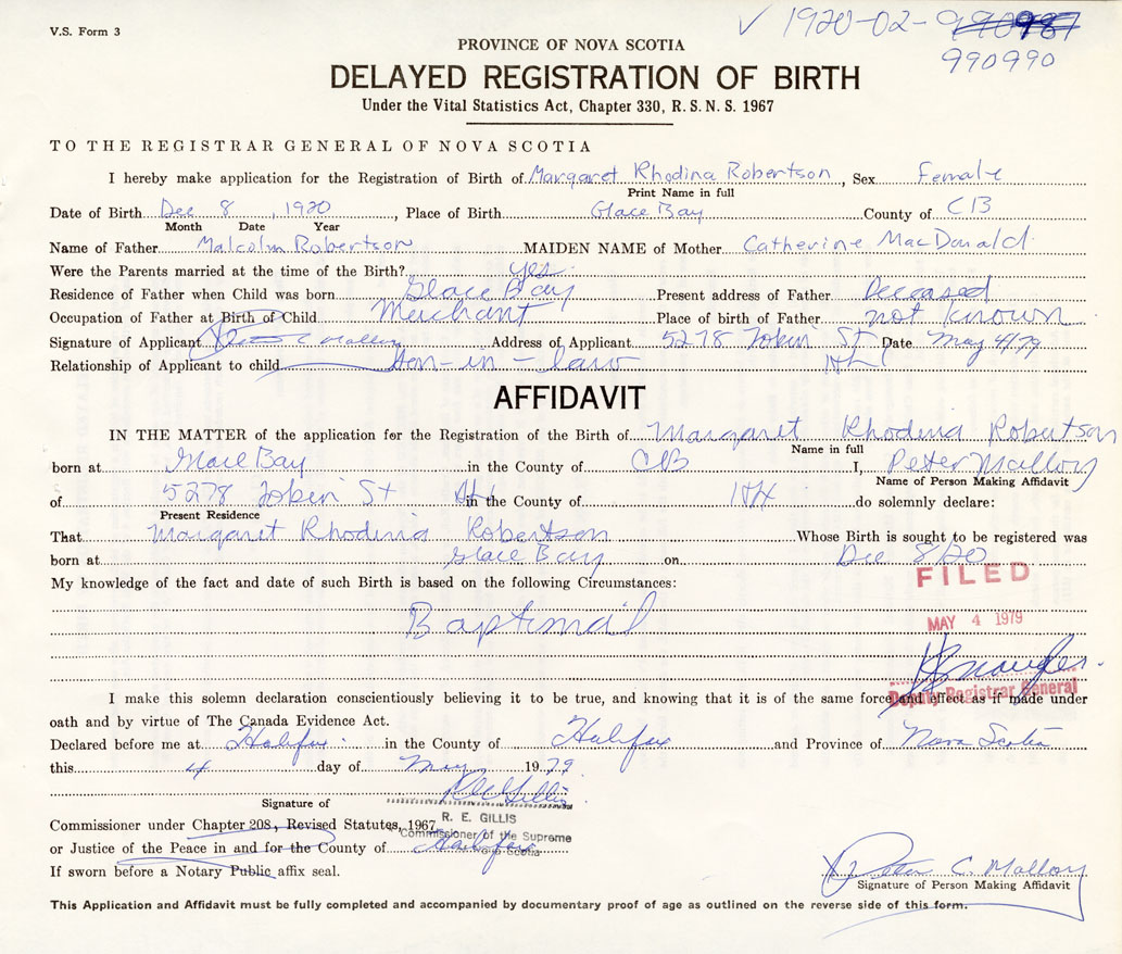 IN THE MATTER of the application for the Registration of the Birth of Margaret Rhodina Robertson