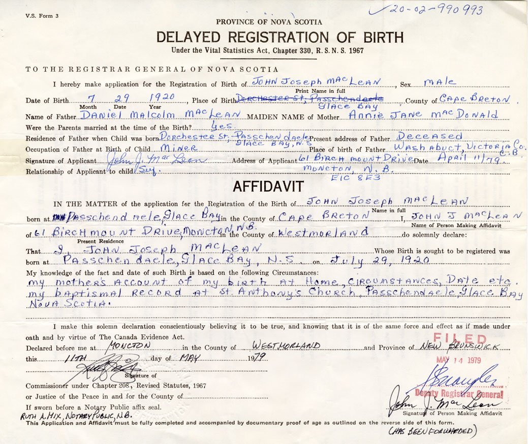 Date of Birth July 29, 1920 Place of Birth Glace BayCounty of Cape Breton